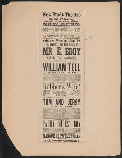 Brougham's Bowery Theatre. Monday evening, September 15, 1856, the performances will commence with "Life in New York; or, Tom and Jerry On a Visit"