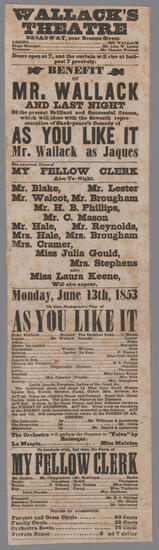 Wednesday, November 5, 1856, Mr. Wallack will appear as Jacques in Shakespeare's play, "As You Like It"
