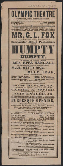 Fourteenth week of G. L. Fox's spectacular ballet pantomime, "Humpty Dumpty". The great comedian and pantomimist, Mr. G. L. Fox, as "Clown"