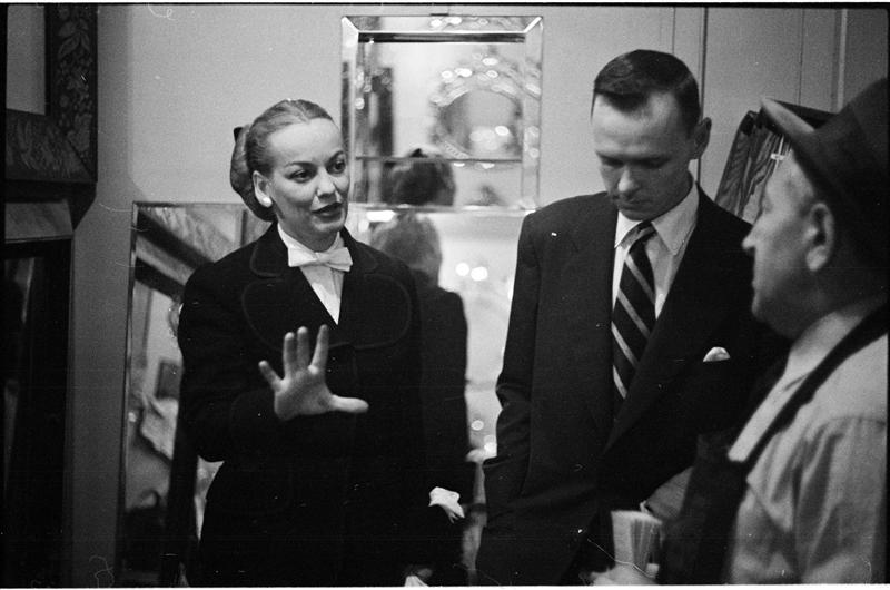 Faye Emerson [Signing autographs in the street and talking to a group of men.]