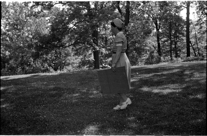 [Unidentified woman sitting on grass with makeshift easel.]