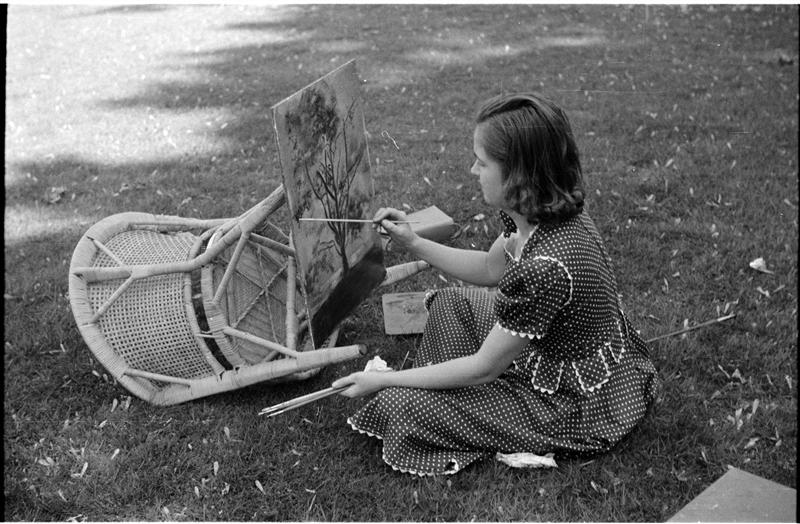 [Felicia Marsh painting outside and paintings by Reginald Marsh.]