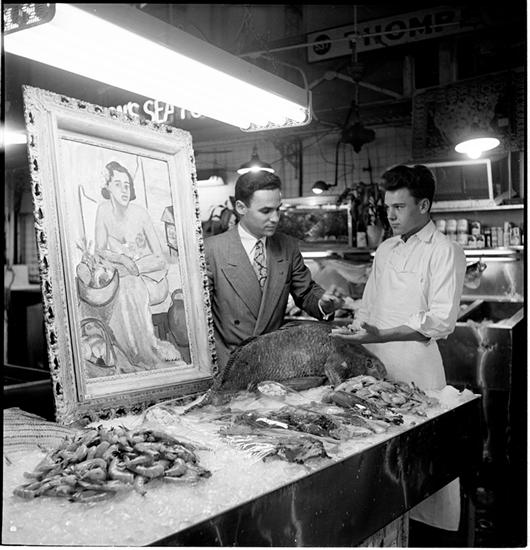 Art in the Marketplace [Painting in a seafood vendor's stand.]