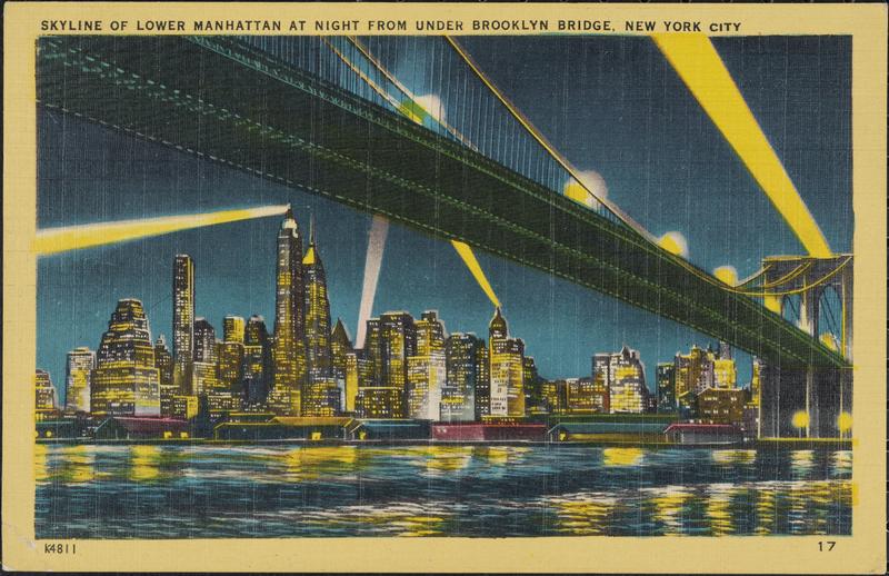 Skyline of Lower Manhattan at Night from Under Brooklyn Bridge, New York