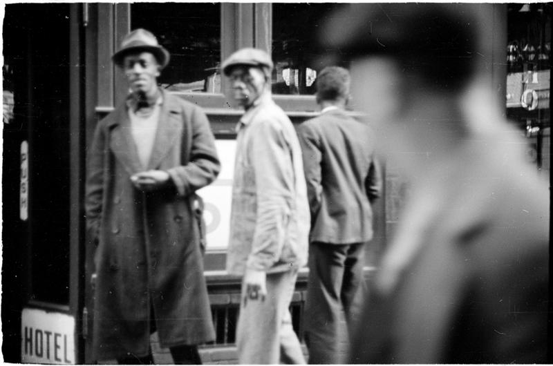 [Destitute men hanging out under the Third Avenue El along the Bowery.]