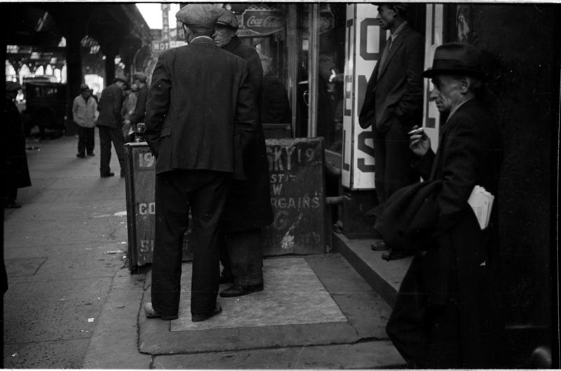 [Destitute men hanging out under the Third Avenue El along the Bowery.]