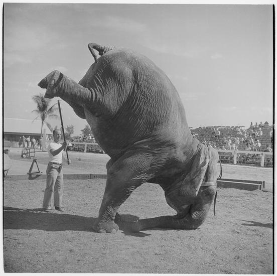 Circus [Ringmaster, with elephants and trainer in the background.]