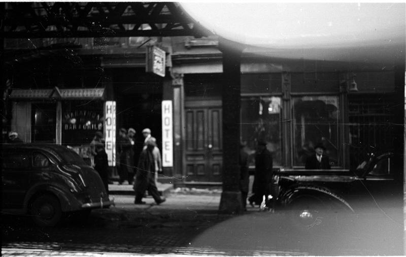 [Destitute men hanging out under the Third Avenue El along the Bowery.]