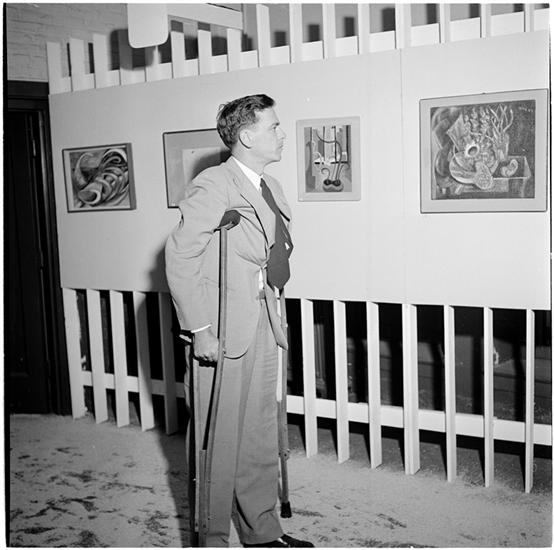 Art in the Marketplace [Man on crutches in a gallery.]