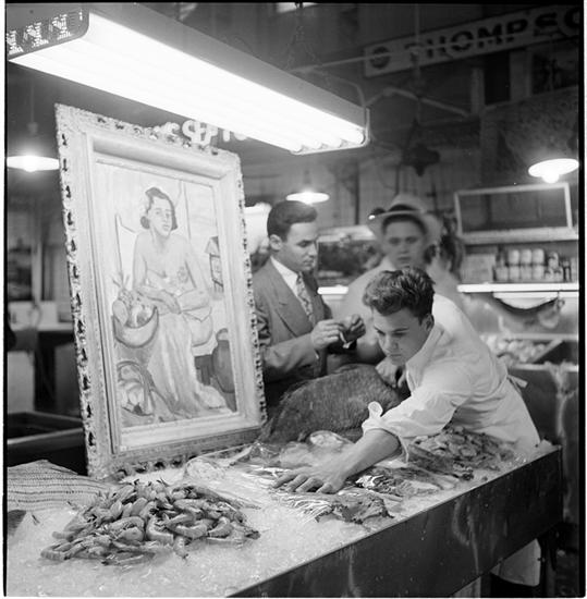 Art in the Marketplace [Painting in a seafood vendor's stand.]
