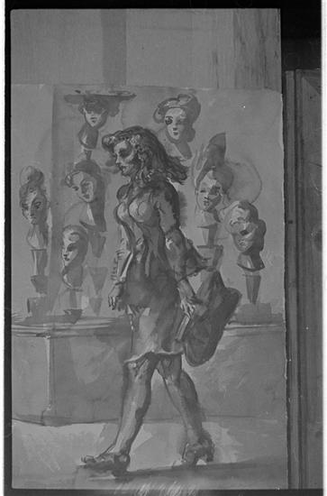 [Signed painting of a woman walking past a window display by Reginald Marsh.]