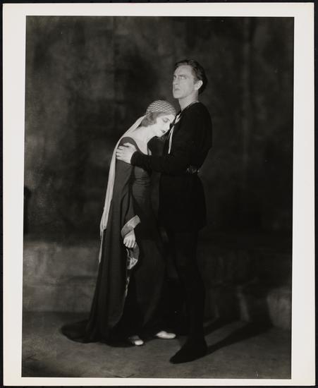 [John Barrymore in the title role of "Hamlet", with Rosalind Fuller as Ophelia.]