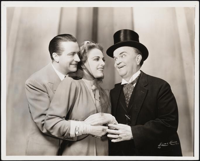 [William Gaxton as Jim Taylor, Vera Zorina as Marina van Linden and Victor Moore as Senator Oliver P. Loganberry in "Louisiana Purchase".]