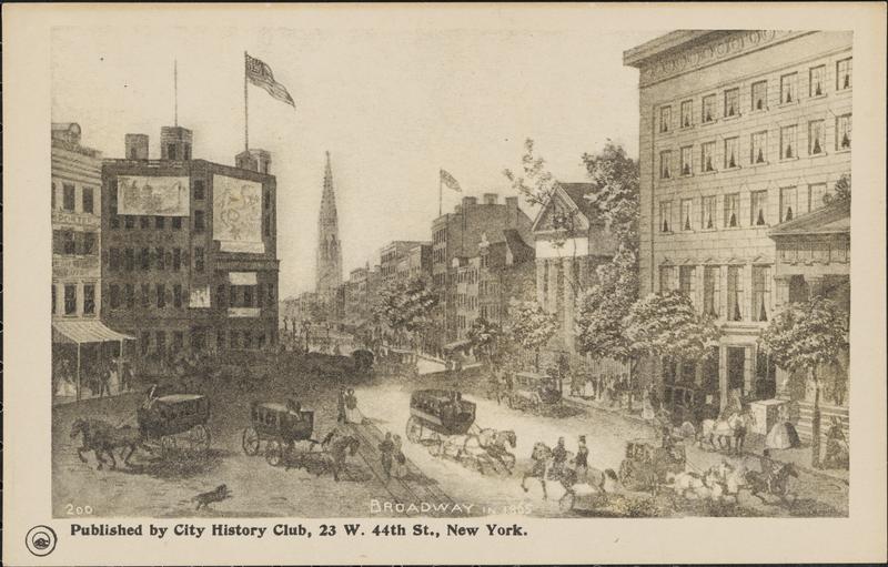 Broadway Series. View looking south, taken from the balcony of the post offices (shown in No. 22 and 28). St. Paul's Chapel in the middle ground at the corner of Vesey Street. At the left on the corne