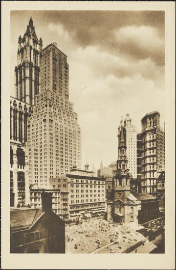 St. Paul's Church, showing Woolworth, St Paul and Park Row Building, New York.