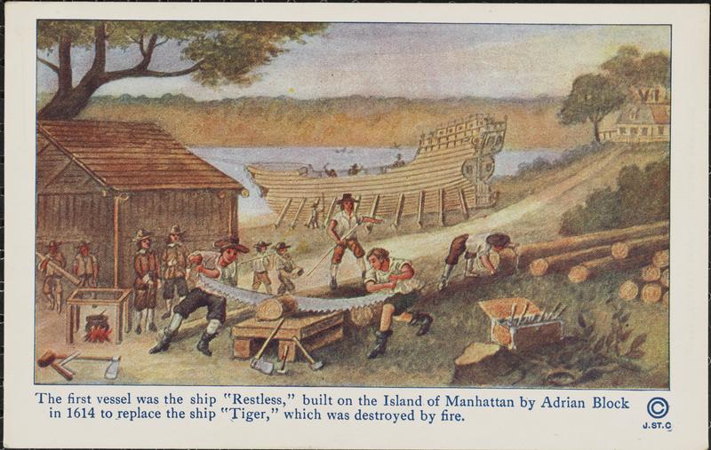 The first vessel was the ship "Restless" built on the Island of Manhattan by Adrian Block in 1614 to replace the ship "Tiger," which was destroyed by fire.