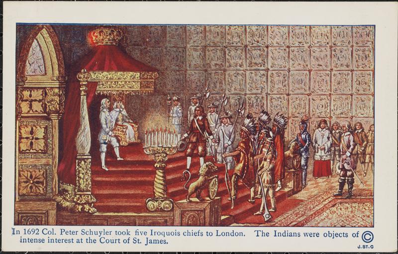 In 1692 Col. Peter Schuyler took five Iroquois chiefs to London. The Indians were objects of intense interest at the Court of St. James.