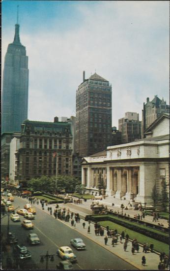 [Looking south from the steps of New York Public Library's main branch toward the Empire State Building.]