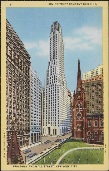 1 Wall Street. Irving Trust Company with Trinity Church steeple in foreground