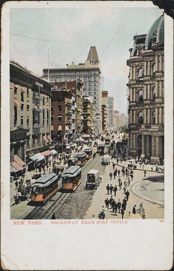 Broadway and City Hall Park showing Post Office and Park Row Building.