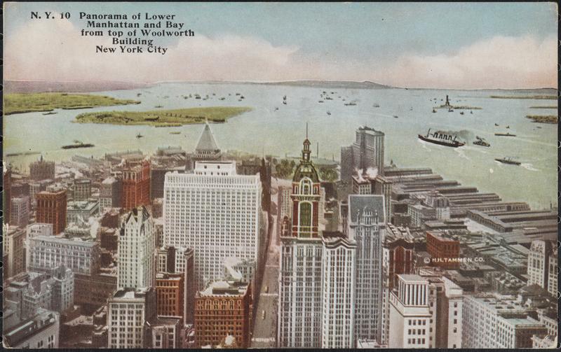 Panorama of Lower Manhattan and Bay from top of Woolworth Building, New York City.