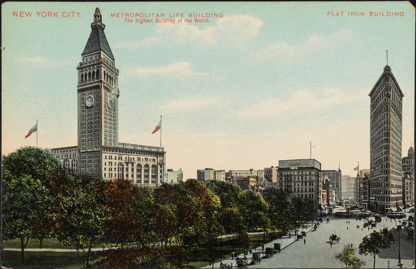 New York City. Metropolitan Life Building, the highest Building of the World. Flat Iron Building.