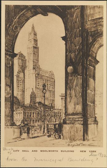 View Through the Arch of Municipal Building Showing City Hall, Transportation Building and Woolworth Building, New York City.