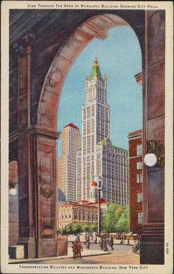 View Through the Arch of Municipal Building Showing City Hall, Transportation Building and Woolworth Building, New York City.