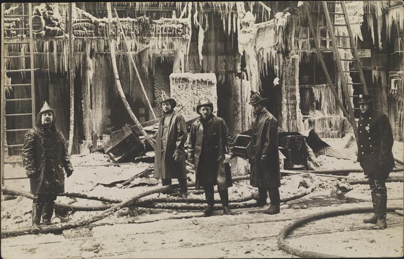 [Firefighting equipment covered in ice at the Equitable Building fire.]