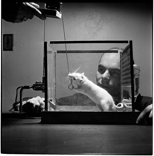 Columbia University [David Anderson, Columbia psychology lecturer, experiments with a rat to teach it to pull a chain and get food.]