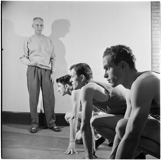 Columbia University [Carl Merner, track coach, with runners.]