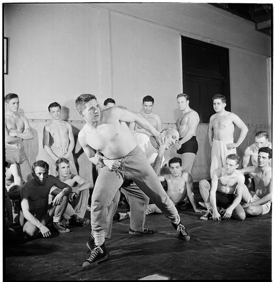 Columbia University [Coach Gus Peterson demonstrating wrestling techniques.]