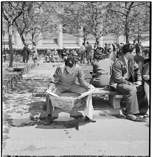 Park Bench Nuisance [Woman reading a newspaper, while a man reads over her shoulder.]