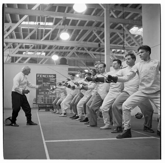 Columbia University [Jimmy Murray, fencing coach, with students.]