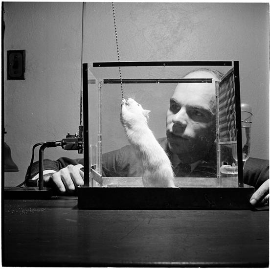 Columbia University [David Anderson, Columbia psychology lecturer, experiments with a rat to teach it to pull a chain and get food.]