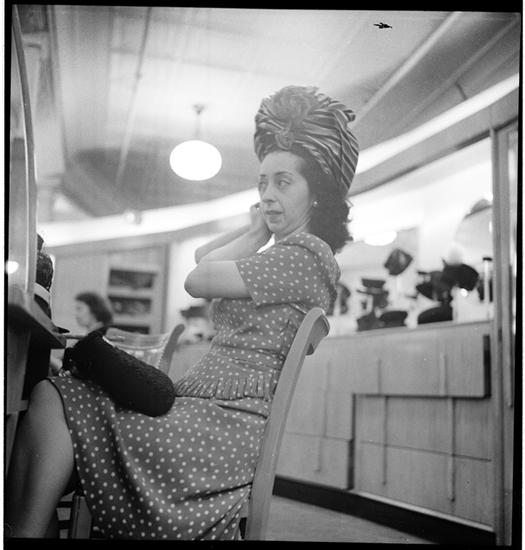 Women Trying on Hats [Woman trying on a hat in a department store.]
