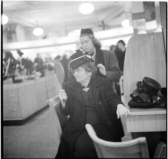 Women Trying on Hats [Woman trying on a hat in a department store.]