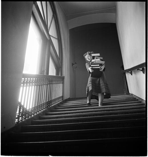 Columbia University [Woman carrying a large stack of books downstairs.]