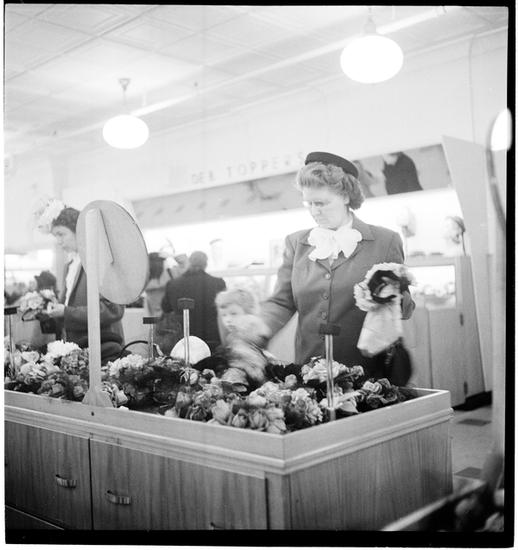 Women Trying on Hats [Woman trying on a hat in a department store.]