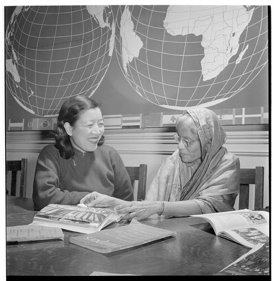 Columbia University [Women carrying a stack of books down a flight of stairs.]