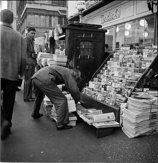 Newsstand | [People browsing through magazine racks at a busy sidewalk newsstand.]