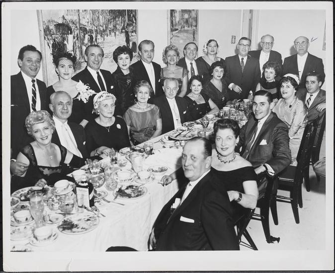 [Seymour Rexite and Molly Picon with a group of unidentified people.]