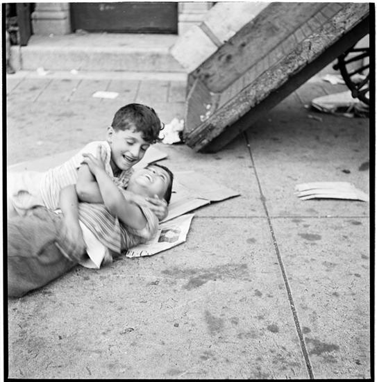 Street Fight [Two boys wrestling on the sidewalk.]