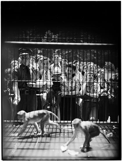 How People Look to Monkeys [Crowd looking at monkeys in a cage.]