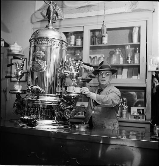 Coffee Service [Man operating a large metal coffee maker inside a café.]