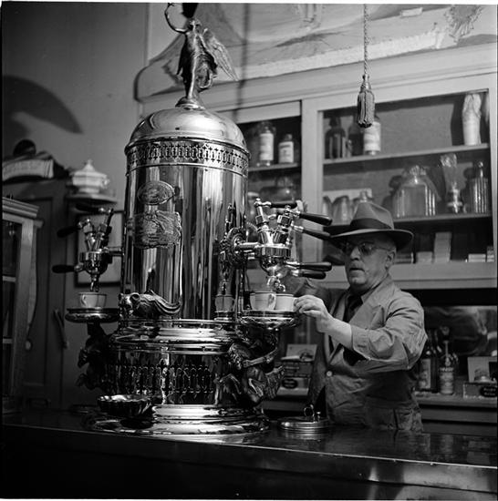 Coffee Service [Man operating a large metal coffee maker inside a café.]