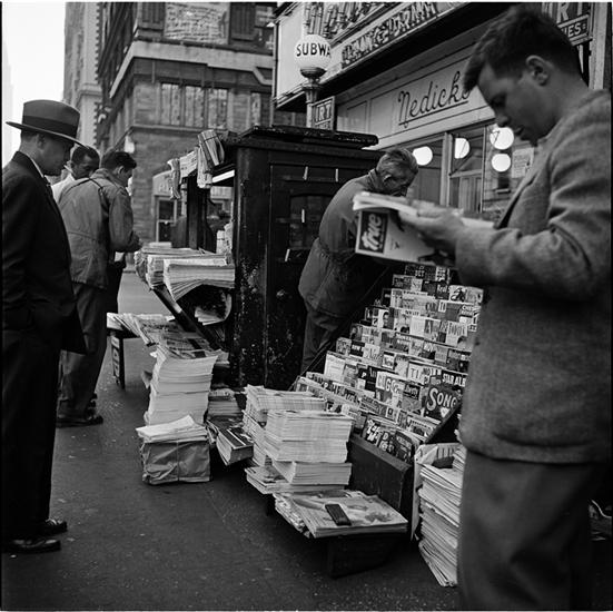 Newsstand | [People browsing through magazine racks at a busy sidewalk newsstand.]