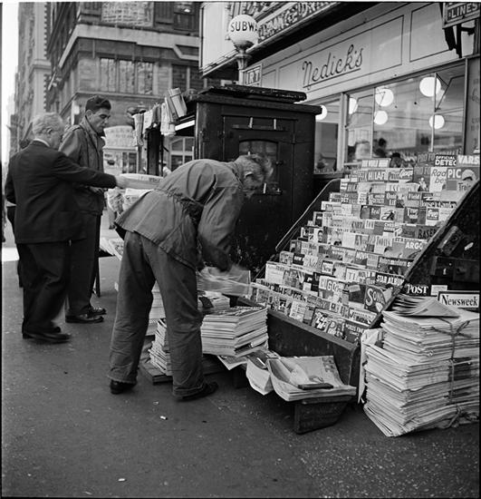 Newsstand | [People browsing through magazine racks at a busy sidewalk newsstand.]
