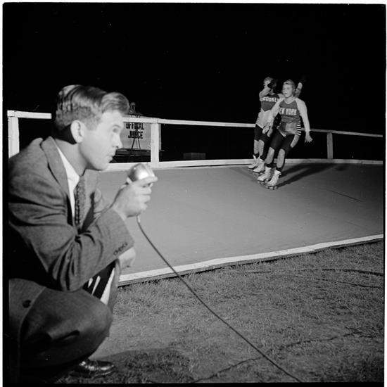 Johnny on the Spot; Johnny Grant's wire-recorded adventures in New York City [Johnny Grant in front of a roller derby track.]