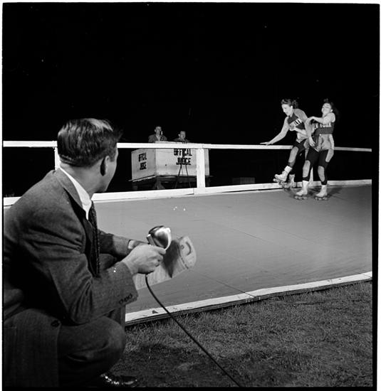 Johnny on the Spot; Johnny Grant's wire-recorded adventures in New York City [Johnny Grant in front of a roller derby track.]